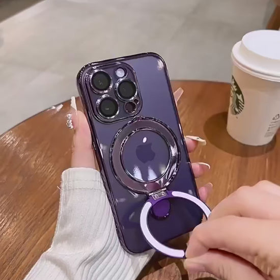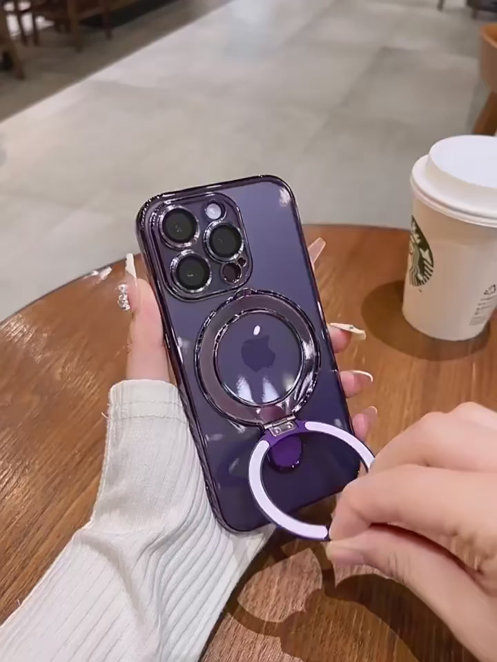 Design transparent effet cristal, cadre robuste et anneau magnétique intégré faisant office de support 360°, parfait pour regarder des vidéos, passer des appels ou poser ton iPhone partout.